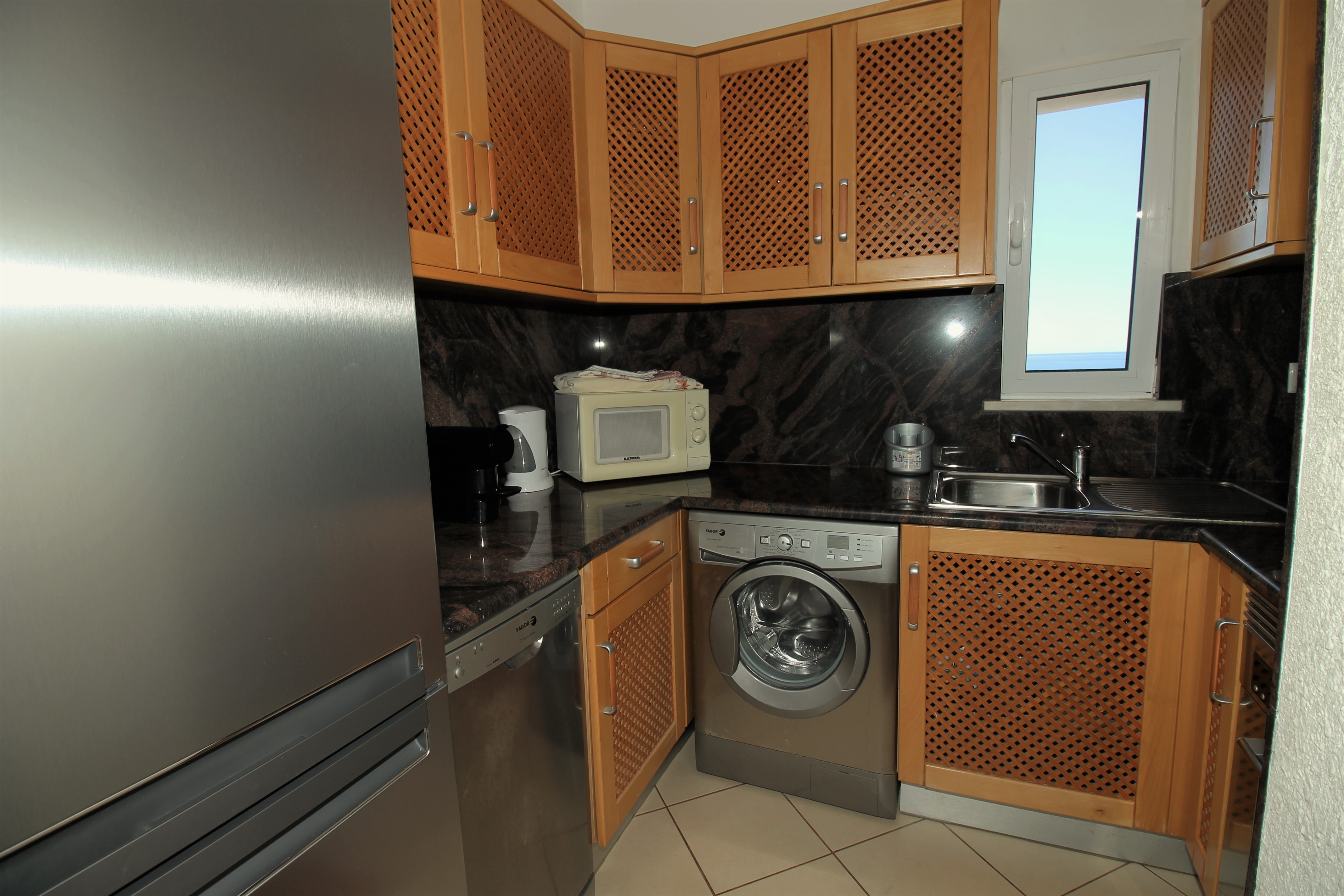 kitchenette equipped with 2- u/c appliances and an u/c oven with glass top hob, light wood finishes and granite tops.